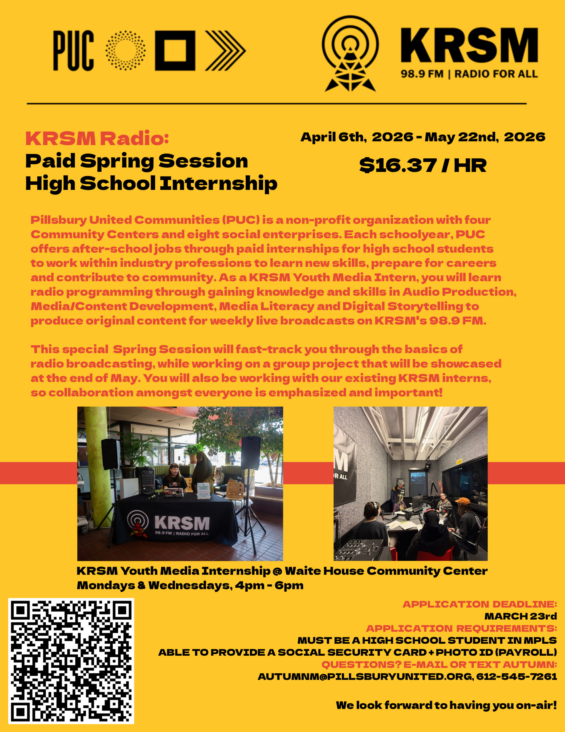 Through this after-school internship with Pillsbury United Communities, students will learn the fundamentals of radio broadcasting while gaining hands-on experience in audio production, media literacy, digital storytelling, and content development. Interns will work together to create original content for weekly live broadcasts on KRSM 98.9 FM.