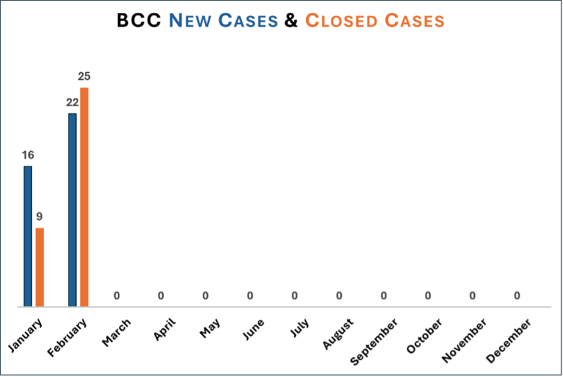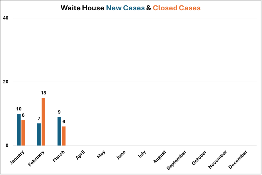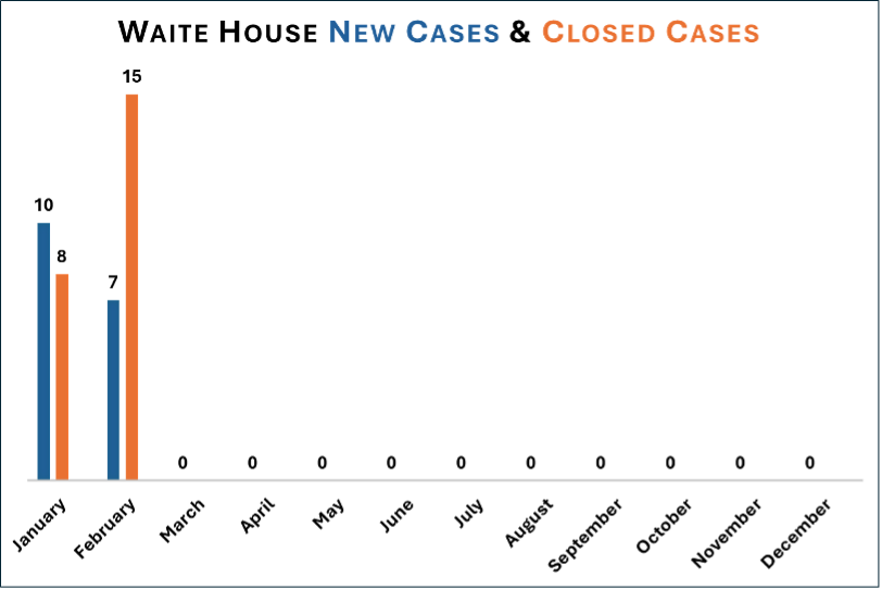 In February the Brian Coyle Center Legal Clinic opened 22 new cases and closed 25 cases. During that same time, Waite House opened 7 new cases and closed 15 cases. It is normal for the Brian Coyle Clinic to have more cases each month because it is open more days a week.