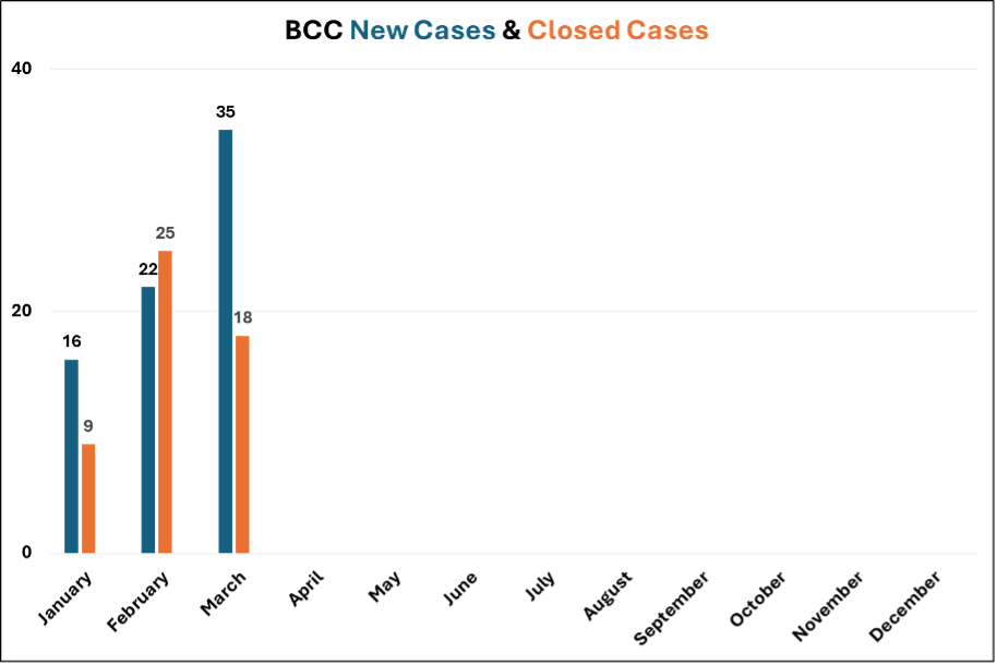 Here are some graphs with each clinic’s monthly new and closed cases. New cases opened in the month are in blue. Cases closed in the month are in orange.
